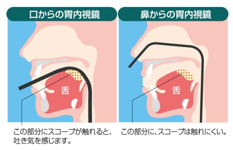 昔の胃カメラ検査は口から内視鏡スコープを挿入する方法しかありませんでしたが、現在は極細のスコープが登場して鼻から挿入する検査ができるようになっています。口から挿入する経口検査は、なにか触れると反射的に強い嘔吐感を起こす舌の根本にスコープが絶えず触れているためとても苦しいものでしたが、鼻から挿入する経鼻検査では舌の根本にスコープが触れないため楽な検査が可能になっています。この極細スコープは直径が5mm程度しかないため、鼻の炎症でひどく鼻腔が腫れているといった特殊な場合を除けばほとんどの方がスムーズに検査を受けられます。